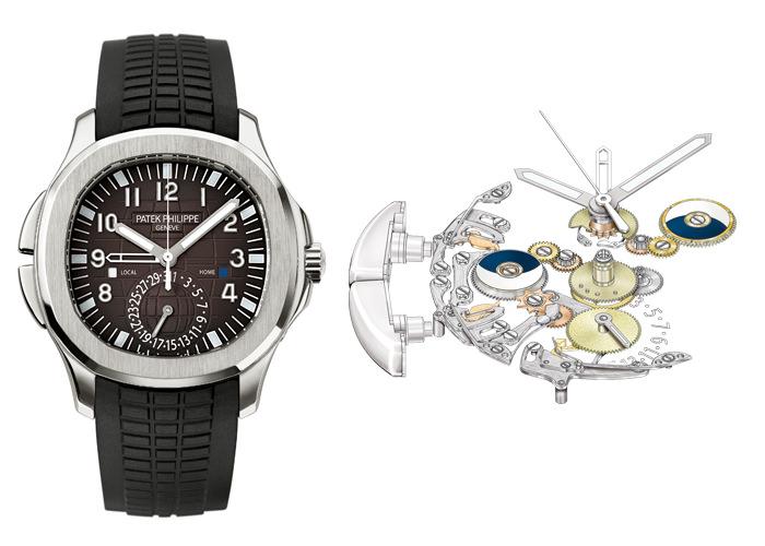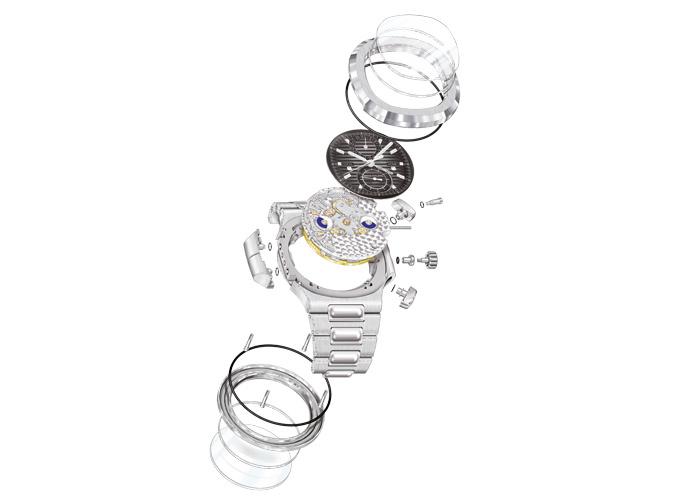 不過,把這種新的旅行時間功能融合入Nautilus計時碼錶還需要在著名的舷窗形狀表殼上投入細緻的工作。這種表殼有兩個側突起,恰好可以包容兩個用於旅行時間功能的附加按鈕。右側的突起用於保護兩個時間按鈕,使其更接近錶冠,機製作用更直接。從人體工程學的角度來看,這些按鈕有着「柔和的手感和強勁的功能」。左側原來的突起被兩個準確模仿其形狀的按鈕替代。儘管增加了新的孔眼,這款表仍可確保防水至120米(12巴)。