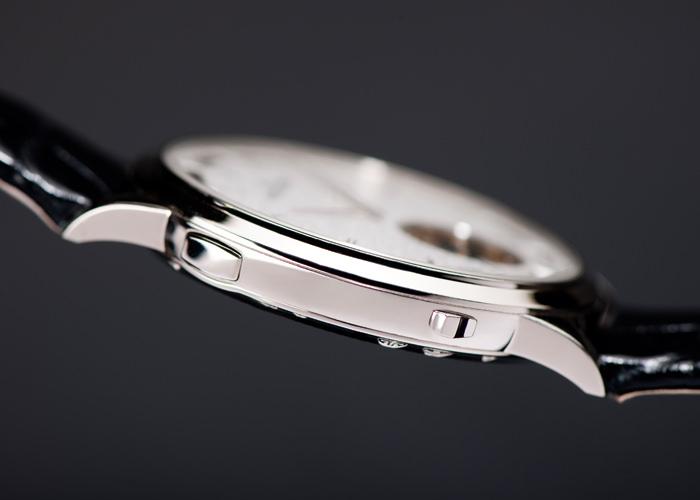 巧妙的外圍擺錘系統為另一個創新鋪平了道路。三問裝置一般都是通過表殼側面的柄軸或推拉部件來控制。這款腕錶用僅為2毫米厚的可伸縮單按鈕(已註冊專利)替代了傳統的推拉部件。可伸縮的單按鈕安裝在腕錶側面的10點鐘位置,由8點鐘位置的小鎖固定。這個設計十分嚴謹,符合人體力學,只需一按就可以啟動打簧裝置,同時保證了完美的防水功能(3 atm),而且外觀優美,表殼光滑、纖薄、渾圓。