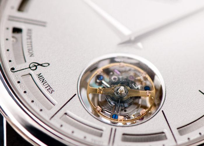 在傳統的陀飛輪內,擺輪一般放置在由上層表橋支撐的支架內;而這款全新的飛行陀飛輪完全無需任何上層表橋。支架顯然已經消失,厚度降到最低並放置在擺輪背後,看起來就像在孤獨壯麗的美景中「飛行」一樣。獨特的結構以不斷跳動的藍鋼遊絲向我們展示了一幅集中向結構中心的壯麗風景。完全手工製作、高性能的圓柱形陀飛輪配備了兩條終端曲線,保證完美的同心圓『呼吸』,從而達到極致的精密(已註冊專利)。