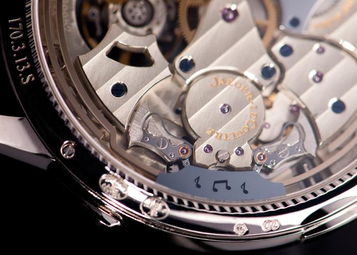 用可伸縮的按鈕控制三問表的這種設計也是一個混合創新,與發出聲響的力度、音質以及聲音順序的音律簡化相關。傳統三問表發聲的順序為時鐘、刻鐘和分鐘。當時間為08:17時,腕錶會敲打時鐘音簧8下,刻鐘音簧1下,分鐘音簧2下。而當時間為08:12時,因為還未到一刻鐘時間,傳統的三問表就會敲打時鐘音簧8下,然後要暫停一下「讓刻鐘過去」才敲打分鐘音簧12下。在積家設計的新裝置里,時鐘和分鐘之間 「寂靜的間隔時間」會消除,從而創造出首個不間斷、完全符合聽覺感受的時間讀數。因此,腕錶發出的聲音無論就力度還是質量而言,都是聲學研究的研究對象,是積家以嚴格的科學方法多年研究的成果。