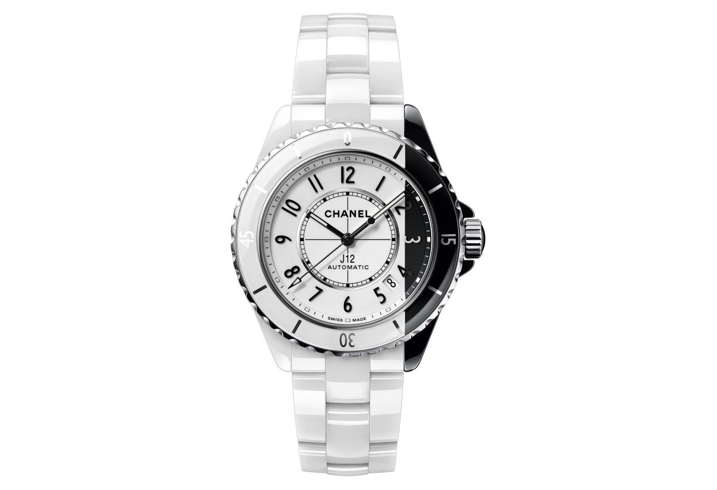 傳統的J12有兩款顏色,黑色和白色。2020年的新款J12其外觀設計為黑白兩種顏色的拼搭。這是一個大膽的嘗試。但是,J12再一次證明了自己,它能夠適應不同的變化。如此明暗交錯的設計,展現了香奈兒二十多年來不斷精進的陶瓷技藝。這一配色上的改變看上去似乎很簡單,然而要將表殼的兩部分切割再進行無縫連接在技術上是非常具有挑戰性的。過程無比艱難,但效果也十分令人驚艷。它搭載天文台認證,12.1自動上鏈機芯。