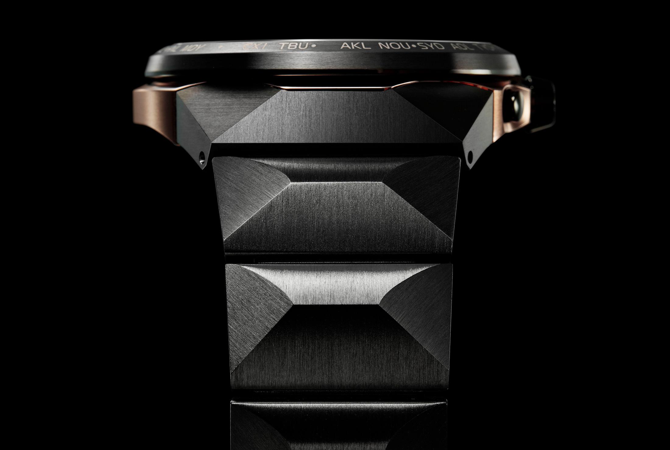 表殼(直徑47.5毫米,戴在腕上頗具氣場)和錶帶構成三維表面的幾何線條,創造出令人驚嘆的雕刻般的角度和陰影。黑色錶盤是一個由六部分堆疊而成的多層結構,構造出深不可測的外層空間。表殼和表鏈的高品質是該款腕錶的最重要特徵。它們由幾個可分離的部件組成,具有線性和前衛的設計,飾以高端Duratect技術DLC塗層和櫻花粉塗層。由於鈦難以加工處理,因此這款精緻的作品是西鐵城50年研發工作的見證。由於其獨特的性能,鈦與航空航天工業密切相關。