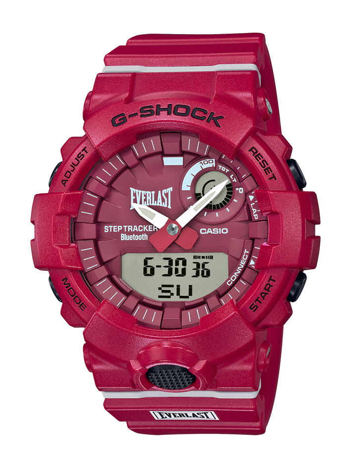 CASIO旗下的G-SHOCK近日宣布與傳奇拳擊品牌EVERLAST合作推出全新聯名表款GBA-800EL,此手錶屬於健身訓練的G-SQUAD系列,搭載智慧藍牙手機連結與計步器功能,內建多重組合的計時碼錶配合日常健身訓練所需。