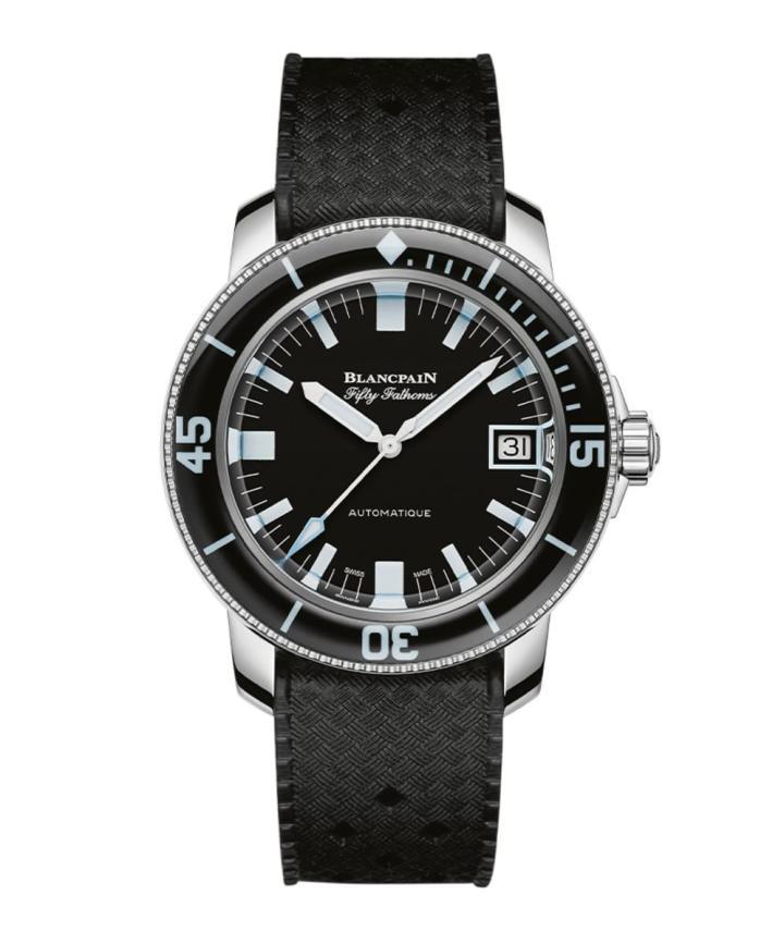 全新五十噚Barakuda Only Watch手錶不僅回歸原腕的美學特質,亦將寶珀長久以來在制表領域積累的豐富經驗及技術創新發揮至極致。手錶採用黑色面盤,搭配塗覆Super-LumiNova藍色夜光塗層的白色時標,並搭配同材質指針及表圈。其中鉛筆形指針覆以白色塗層,秒針則鑲以淺藍色邊。原型表的關鍵元素——日期顯示,以視窗的形式在新型表款中回歸初代手錶的相同位置。