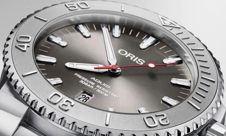 ORIS本身並沒有幫Aquis推出對表,但是系列中有不同表徑大小、不同配色的設計可以組成一對,在品牌2019年的新款中,Aquis Relief是頗受市場矚目的一款,這款表以不鏽鋼材質打造,單向旋轉表圈經過磨砂處理與表殼的拋光和拉絲處理形成對比,單一的不鏽鋼外觀因而產生豐富的視覺層次。通常提到潛水錶,傳統一點的會採用黑色面盤,現代一點的則是直接以藍色比喻海洋,然而Aquis Relief日期表卻選擇了相對少見的灰色替面盤着色,有人可能會對這配色感到疑惑,實際上ORIS的設計靈感一樣是來自海洋,只是並非我們刻板印象中總是湛藍光鮮的藍色大海,品牌以灰色放射紋面盤勾勒出風雨中瞬息萬變的海象畫面,略深的灰色與不鏽鋼表殼的銀灰色構成第二種視覺層次。