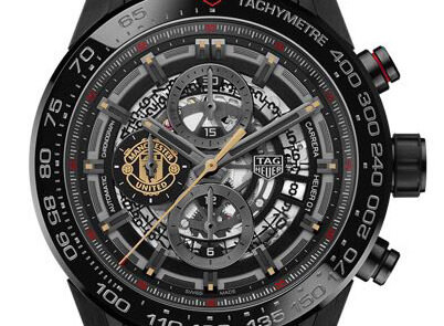 這款充滿運動風範的腕錶搭載品牌自製Heuer 01自動機芯,採用黑色蛋白石面盤,位於9點鐘的計時盤印有曼聯標誌。表殼由黑色PVD塗層不鏽鋼打造,搭配黑色陶瓷表圈、米色中央秒針及時標。紅色真皮內襯橡膠錶帶飾以黑色縫線,輝映這家知名英格蘭足球俱樂部的鮮艷紅色。相同的紅色設計元素還運用於60秒刻度的外緣及壓印卡萊拉系列名字與機芯型號的表背。藍寶石水晶表鏡印有盾牌標識以及米色"999 - THE TREBLE - 20 YEARS "及"1 OF 99"字樣。