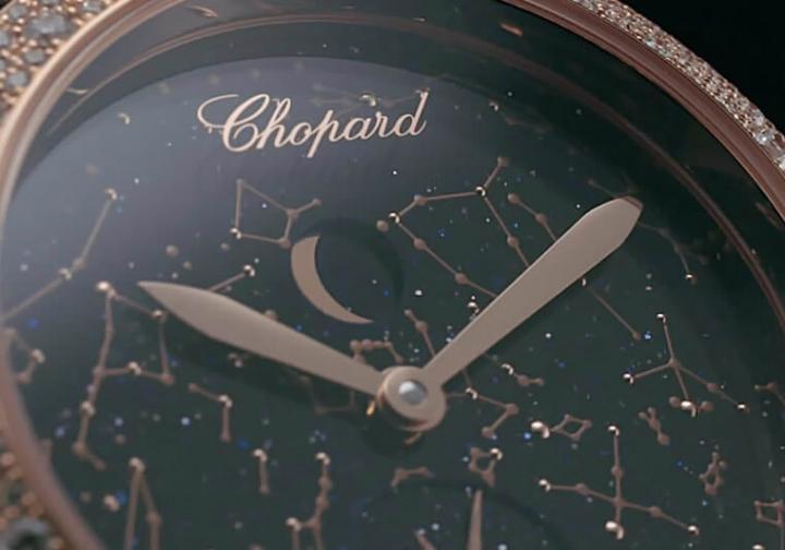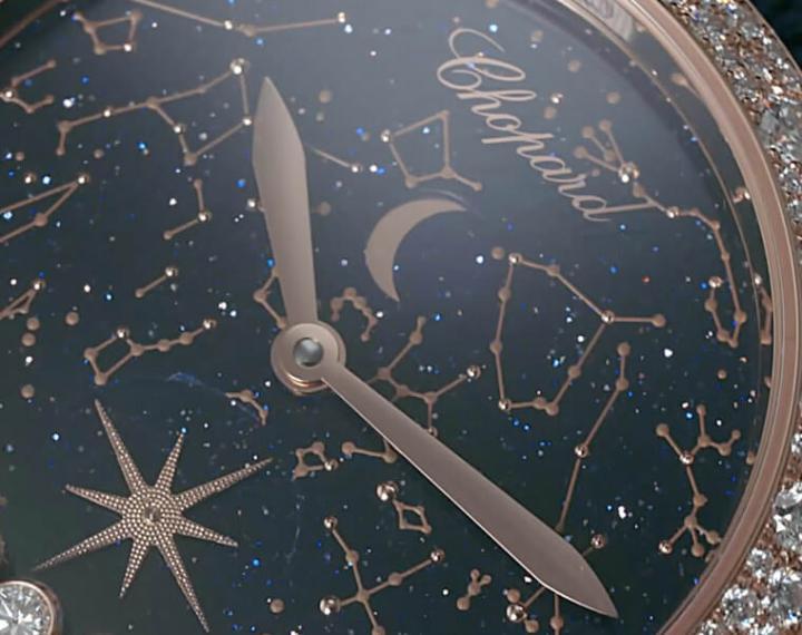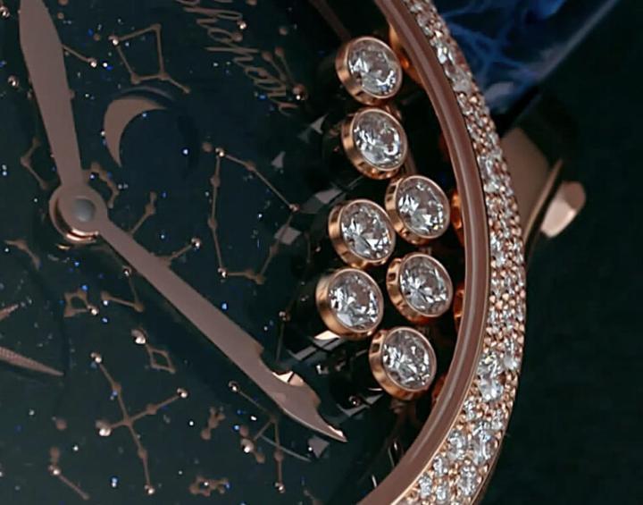 Happy Moon月相腕錶採用玫瑰金打造表殼,從其表耳固定裝置以及錶冠等類似鑽石多切面的造型,讓人想起了Happy Sport的外型特徵,蕭邦另在表圈部分以雪花鑲嵌工藝鑲滿大大小小的鑽石,不規則的排列方式考驗着師傅的美感、經驗與技術,鑽石反射的光芒也因而更變幻莫測。Happy Moon月相腕錶的面盤一如前面提到乃是採用藍色砂金石材質,砂金石原本就是表壇在製作星空表時常見的元素,因為其湛藍色澤中又帶有結晶的晶亮感,正是比喻星空的絕佳媒材,蕭邦順着砂金石的特性在面盤上以金質點綴了北半球的星座分布圖,就連6點方向的小秒盤也改成星星造型,秒針不停旋轉讓面盤上的星空畫面多了幾分動態感,至於12點方向位在蕭邦Logo下方的便是表款的重點——月相顯示窗,視窗以簡練的設計呈現出弦月到滿月間的變化,佩戴者不需特地抬頭遙望夜空,只要輕瞥腕錶的面盤就能夠觀賞到月亮移動的軌跡,象徵星空的藍面讓人看得心曠神怡。另外屬於此系列最大特徵的滑動鑽石共有7顆,蕭邦以玫瑰金包覆鑽石,使其能夠自由自在的面盤空間上隨着佩戴者腕部動作恣意滑動,令面盤的星空意象更加活靈活現。