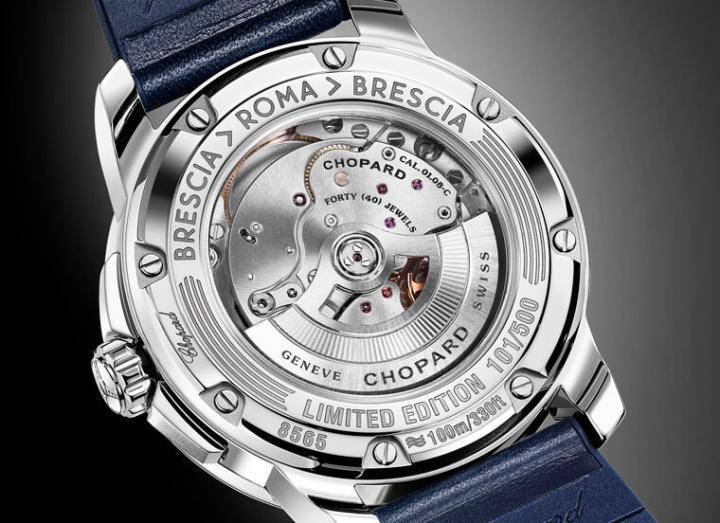 表款搭載蕭邦嶄新研發的Chopard 96.25-C自動機芯, 這枚機芯的功能性比起Happy Sport的三針款來得複雜,且其採用微型自動盤設計的好處在於可以降低機芯的厚度,使腕錶在顯時功能變得更充實之餘,還能兼顧佩戴舒適度,且機芯無論是底板與夾板的日內瓦波紋與魚鱗紋,抑或零件邊緣的倒角拋光等,也都展現一流表廠的身手,同時底蓋邊緣所鐫刻的」CHRONOMETER」字樣也透露出機芯的走時精準度通過瑞士天文認證,於搶眼外貌下同樣具備紮實可靠的內涵。