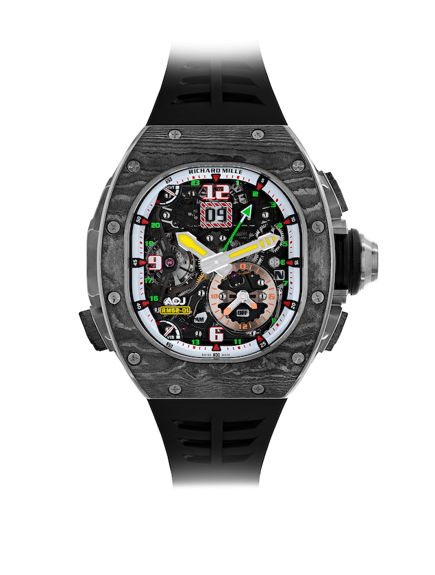 RM 62-01配備了一系列商務旅行人士所需的複雜功能,同時打破了旅行腕錶的標準模式。它包含第二時 區的UTC時間設置,由中間的綠色指針指示。在藍寶石面盤下方,9 點鐘位置的陀飛輪內置一枚擺頻為3Hz的可變慣性擺輪。超大日期顯示在12點鐘位置,同時帶有RICHARD MILLE 典型紅色斜線線框,11 點鐘位置則有70小時動力儲存的指示器。