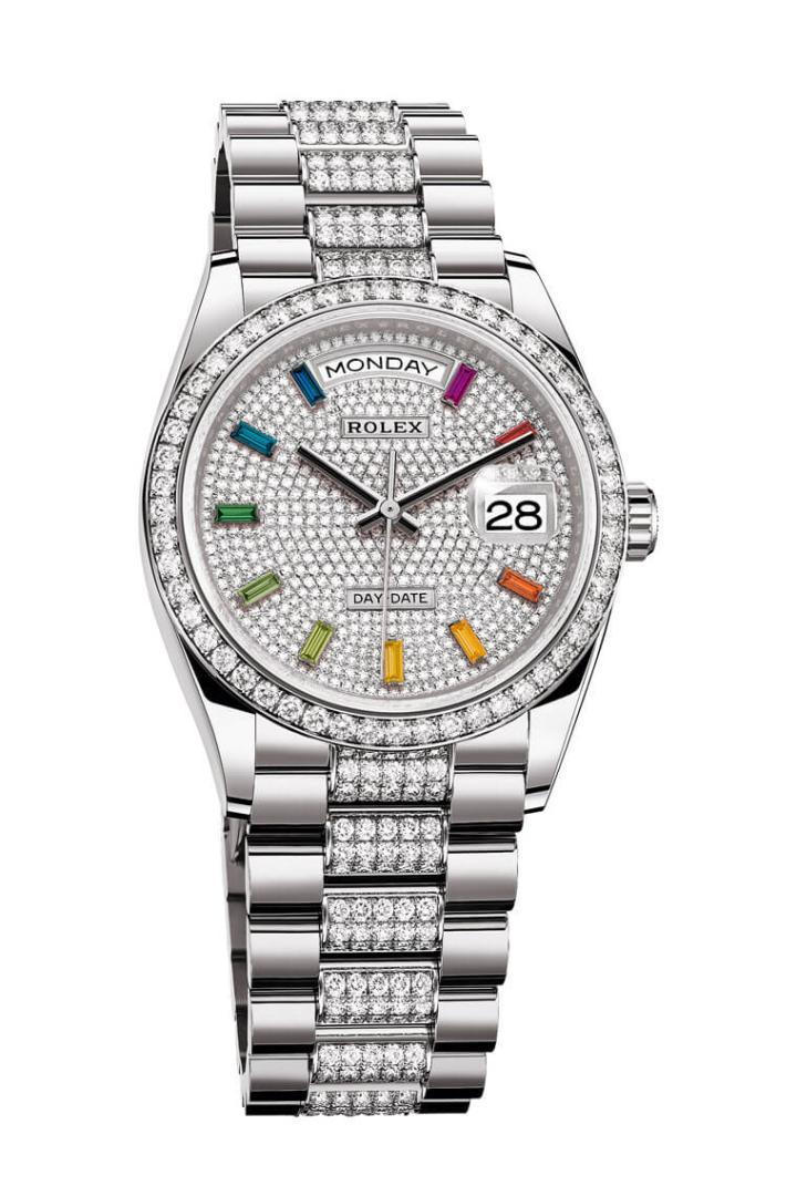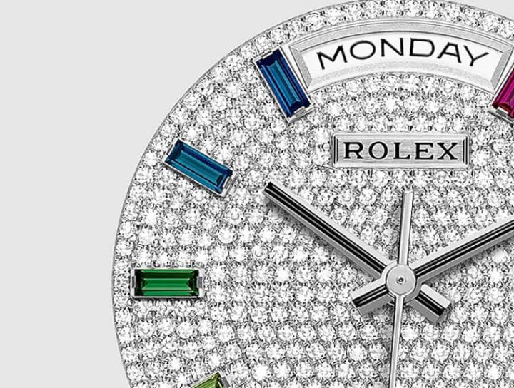 Day-Date採用貴金屬表殼、上面鑲有鑽石這些特徵都還算系列常見特徵,不過這款不只是用鑲滿鑽石來吸引人而已,雖說它除了表圈和鏈帶以外,在面盤上又還鑲了542顆鑽石,閃到讓人都快忘了要看時間,不過128349RBR特別吸引人的地方,恐怕還是在時標方面鑲上的10顆彩色寶石。36mm的Day-Date面盤格局一般來說可以分成三種:矩形時標、羅馬數字時標和寶石時標,最後一種又分成鑲鑽石或彩色寶石等款式,鑲嵌彩色寶石的Day-Date 36mm其實黃金、白金和永恆玫瑰金等三種材質都有,不過比起黃金或永恆玫瑰金,彩色寶石時標放在白金表殼身上的效果更強烈,因為白金和鑽石的銀白色澤不僅不會搶了寶石的光彩,反而還能讓這些漸變色彩看起來更明顯,以實用性的角度而言,彩寶當作時標看上去一清二楚,以裝飾性的角度,比起全鑽的一片銀白,彩色寶石融入繽紛顏色也更能幫手錶的視覺效果加分。