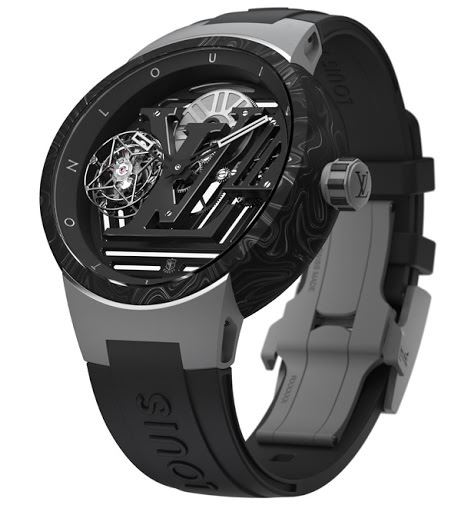 手錶表殼外圈以CarboStratum®製成,這是一種路易威登特別開發的複合材質,在特定溫度下百餘層碳纖維以隨機方式疊合壓縮,這種超硬材質穩定後,再以新世代多次元銑床加工。這些操作形成柔和卻突出的曲線,賦予每隻腕錶獨特風貌。完成後的碳疊片完美貼合Grade 5鈦金屬基底。最後微加工擠壓成型的鈦金屬表耳再鑲嵌進CarboStratum®表殼,形成完美和諧的組合。