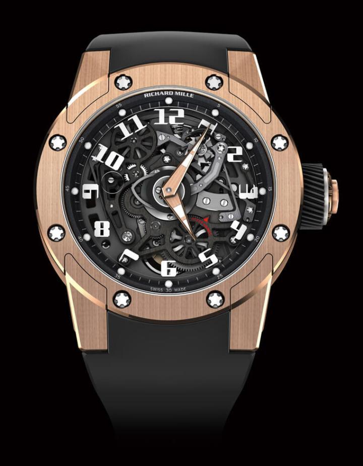 RM 63-01與品牌其他的圓形作品不同,是第一款採用曲面上層表殼的圓形腕錶。以紅金打造表徑42.7mm的表殼,藍寶石水晶表面印有數字時標,保護着劍形指針與輕盈堅固的鈦合金底板。動力心臟搭載RICHARD MILLE開發的CRMA3自動上鏈機芯,為5級鈦合金材質,經PVD鍍層處理,並配備5N紅金雙向自動盤,動力儲備達50小時。