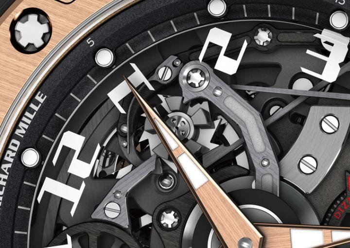 擁有特殊旋轉功能的RM 63-01,在1點方向可以看到控制藍寶石刻度盤的柱輪機構