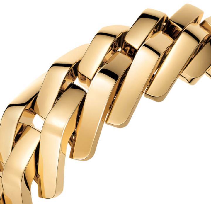 提到Maillon de Cartier前所未見的鏈帶造型,卡地亞鐘錶創意總監Marie-Laure Cérède是這麼說的:「我們希望能製作出凹凸有致的鏈帶,並透過創新設計而超越一般鏈帶的結構,從中流露出更多的律動感和張力。」Cérède女士確實言簡意賅地點出了這種鏈帶設計的特色,由於鏈節之間的排列並非工整平面化,但帶有斜角、呈立體造型的鏈節彼此之間又是遵照固定的角度彼此接合,因此使得腕錶的鏈帶在靜態中額外衍生出一種扭轉盤繞的動態感,仿佛在腕錶上注入了一股節奏使得鏈節充滿活力四射的律動感,而正是由鏈帶予人的強烈視覺印象,成功替Maillon de Cartier腕錶奠下極具辨識度的個性。