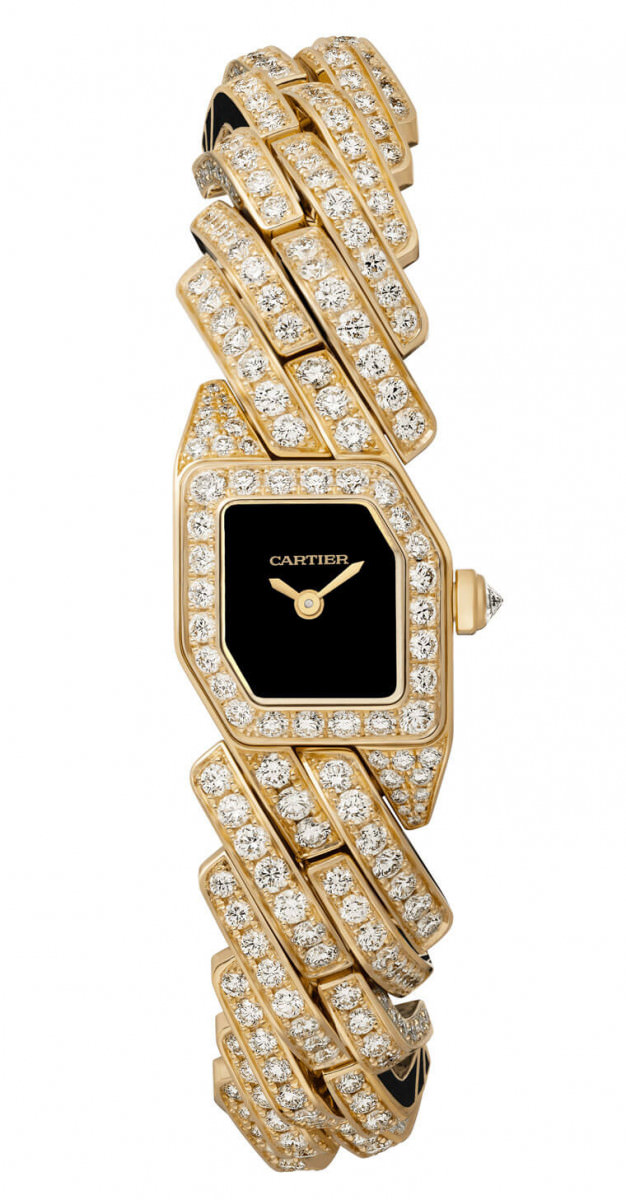 18K黃金材質/石英機芯/時、分顯示/黑漆面盤/表款鑲鑽487顆/藍寶石水晶鏡面/防水30米/