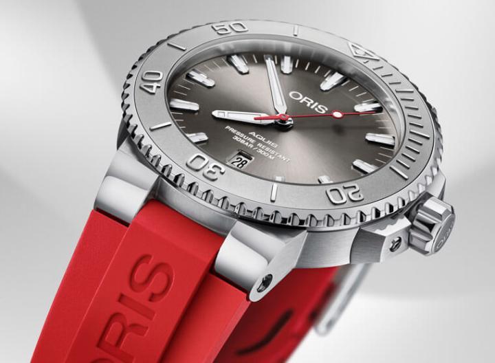 第一眼看到Aquis Relief日期表的灰色面盤,可能會有點疑惑它和海洋冒險這個主題有什麼關聯?當然如果要呈現海洋主題,最直接的方式就是採用藍色面盤,但過往不管是ORIS本身或其他品牌的潛水錶早已有許多藍色面盤設計,這樣一來反而不容易突顯Ernst Bromeis以及保育計畫的特別和重要性。因此ORIS選擇灰色的靈感其實是在描繪風雨中多變的海洋畫面,在風雨交加的海面上,它可不像我們一般印象的蔚藍,反而是一遍灰色迷濛,也因此手錶才會看起來有點跳Tone的使用灰色元素。