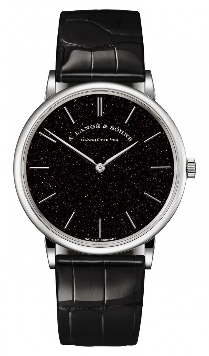 A. LANGE & SÖHNE朗格最近除了Saxonia Outsize Date之外,很巧地也發表了Saxonia Thin的改款。Saxonia Thin也是品牌在2018年所推出的作品,這款表殼厚度僅6.2mm的德制超薄表面盤採用了呈現銅藍色的砂金石,展現出猶如星空的效果,賦予簡約的二針手錶一股品牌少見的浪漫詩意。2020年改款的Saxonia Thin主要也是調整面盤顏色,這次朗格使用的是表壇少見的黑色砂金石玻璃面盤,讓手錶散發出與前作同中求異的視覺效果。