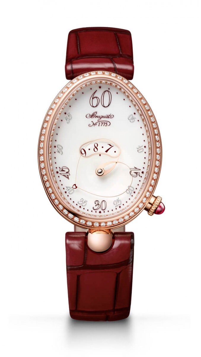 Reine de Naples Cœur 9825以玫瑰金製成36.5x28.45mm的橢圓形表殼,表圈和面盤外緣鑲上128顆鑽石,錶冠則鑲有1顆0.25克拉的蛋面切割紅寶石,並且搭配紅色鱷魚皮錶帶塑造出甜美的外觀形象,附帶一提,皮帶上的玫瑰金摺疊扣也鑲了多達28顆鑽石,華麗風格由表殼貫穿到表扣。