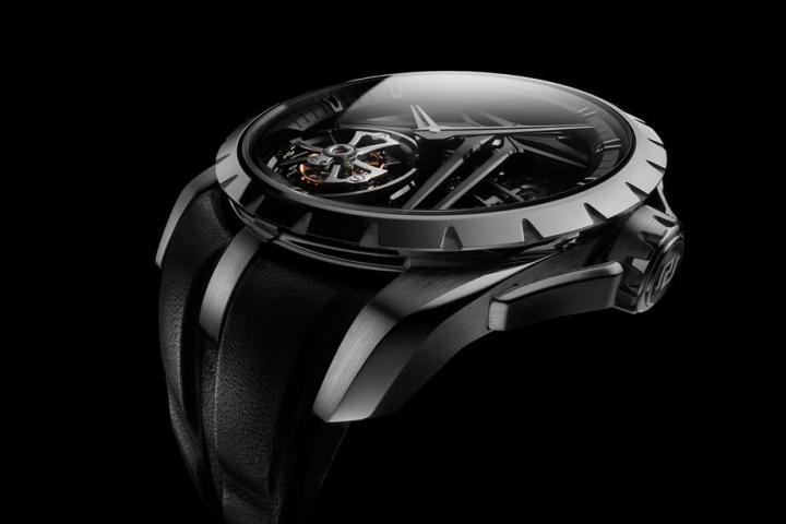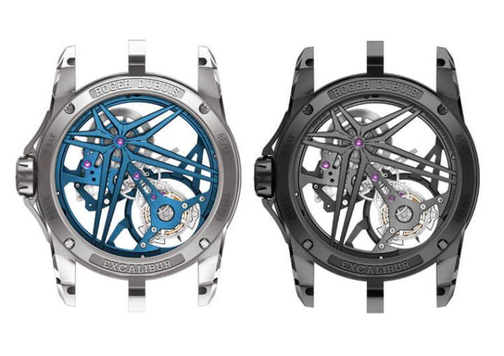 新款Excalibur飛行陀飛輪分別採用深灰DLC塗層鈦金屬、CarTech Micro-Melt BioDur CCMTM鈷鉻鉬合金以及品牌全新開發的Eon Gold玫瑰金等三種材質製作表徑42mm的表殼。Excalibur系列外觀特色如三岔表耳、坑紋表圈等藉由不同材質的詮釋也呈現出同中求異的個性,品牌按照表殼材質的不同,替鈦金屬以及Eon Gold玫瑰金款搭配黑色立體小牛皮錶帶、鈷鉻鉬合金款則是搭配藍色立體小牛皮錶帶,它們都具備錶帶快拆設計,讓人可以輕鬆DIY換上不同錶帶轉換一下心情和風格。