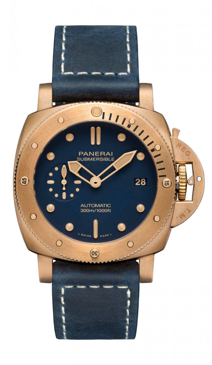 身為近年掀起表壇青銅熱潮的先驅,PANERAI沛納海自從2011年首度推出PAM00382以來轉眼過了十年,回顧前幾年,品牌陸續推出過四款青銅表,每次推出都會有一些細節變化的小驚喜,例如最近一次推出的青銅表四代目PAM00968就首度加上了陶瓷圈,同時面盤的咖啡色也有別於前三代的藍色或綠色。2021年品牌第五度推出青銅潛水錶Submersible Bronzo Blu Abisso(PAM01074),乍看之下手錶和沛納海2017年推出的PAM00671因為同樣是青銅表圈加上藍面而有幾分相似,但其實PAM01074反而是沛納海五代青銅表以來變化最大的一款。