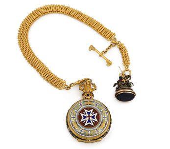 拍賣會中最引人注目的是一款非常罕見的具有重要歷史意義的帶有匹配表鏈和印章的黃金琺瑯和鑽石手錶,它很可能是1880年左右為King Ludwig II of Bavaria巴伐利亞路德維希二世國王打造的。它代表了Saint George的Royal Military Order,這款特殊的手錶估價為30’000-50’000瑞士法郎/ $27’000-44’000美元 / 或€ 20’000-30’000歐元.
