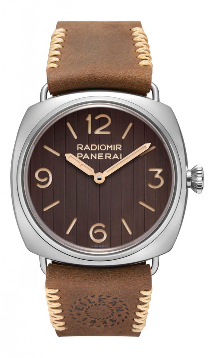 PAM01243的精鋼表殼特別採用霧面和氧化處理達到仿舊效果,為的是展現Eilean帆船的歷史歲月感,它的大尺寸枕型表殼、焊接線型表耳這些特徵都是來自早期的Radiomir手錶,而在表殼左側,我們可以看到與Eilean帆船船身相同的龍紋徽章以及」EILEAN」字樣。而在手錶的面盤上,首先映入眼帘的是讓人聯想起帆船甲板的垂直線條裝飾,如同表殼,這些條紋裝飾也特別採用舊化處理,讓它的棕色調看起來更有久經時間焠鏈的感覺。至於手錶的三明治面盤結構下方以及指針則是塗上色Super-LumiNovaTM夜光塗層,它們在黑暗環境中會發出綠色的夜光效果,佩戴者因而能夠清楚閱讀時間。