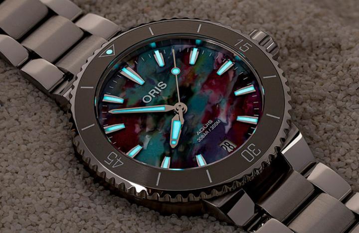 但手錶的規格其實並非Aquis Upcycle日期表這次的設計重點,因為ORIS是在其實用基礎上融入環保概念,品牌使用回收再制的PET塑料來製作面盤,因此面盤上那些看似抽象繽紛的藝術顏料感裝飾事實上是我們在海邊見到的塑膠垃圾再生而來!高反差效果令人感到驚艷。由於PET塑料在再生過程中形成的圖案與顏色並沒有一定規則可循,因此每一款Aquis Upcycle日期表的面盤紋路都不可能一模一樣,這帶有隱性限量感的風格讓人得以享受它的美感之餘,還能提醒佩戴者共同為減少海洋塑料垃圾這樣的遠大目標而努力。