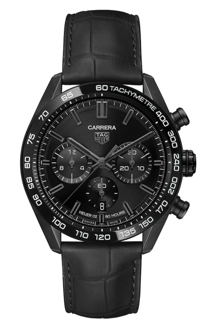 表款的44mm表殼屬於不鏽鋼材質,之所以外觀會一片黑是因為泰格豪雅運用黑色DLC塗層,搭配黑色鱷魚皮錶帶,包括摺疊扣也都經過DLC鍍黑,可是說是黑得很徹底。Carrera H02湛黑版限量計時碼錶的黑色表圈為耐刮堅硬的陶瓷材質,上面的測速計刻度填上白色讓刻度易於判別。至於面盤方面也是貫徹同樣黑的意念,連時標與指針都是黑色的,營造出低調沉穩的氣質。