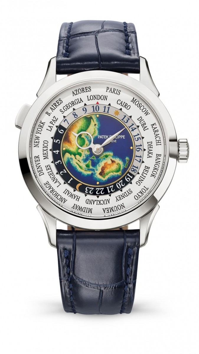 表款的表殼線條與功能基本上都維持不變,不過皮革錶帶顏色因應表殼從暖色調的黃金改為冷色調的白金而同步換上深藍色,兩相搭配起來散發的是另一種紳士優雅品格。不管5131或5231世代,手錶雖然都是在面盤中心加上掐絲琺瑯的鮮艷地圖圖案,但其實不同材質之間,面盤的琺瑯地圖也會出現專屬變化,例如5231J的琺瑯地圖範圍聚焦在歐洲、非洲與美洲,到了新作5231G身上則轉移至東南亞以及大洋洲區域。