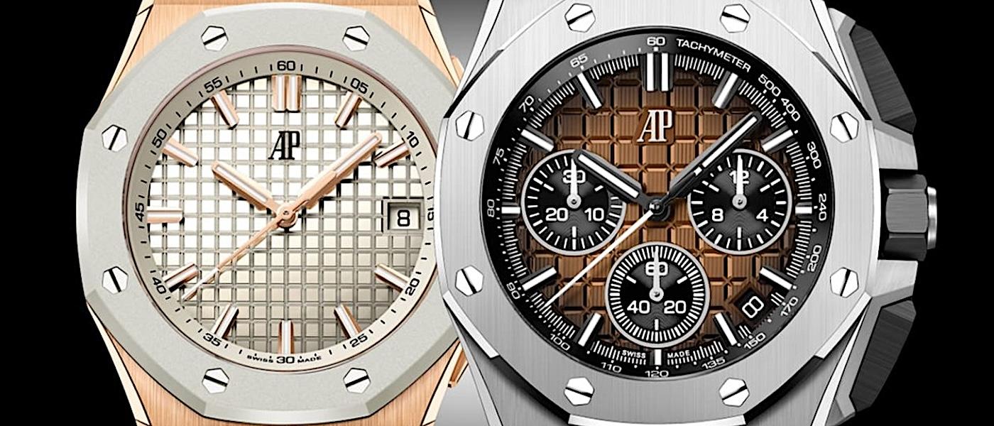 愛彼受到古巴著名雪茄品牌Habanos啟發,替手錶打造出煙燻古銅⾊Mega Tapisserie超⼤型格紋面盤,古銅色調從面盤中心往外園由淺漸變深,直到最外圍的測速計刻度整個變成黑底白字,至於面盤上的三枚小錶盤也同樣是黑色,包括日期轉盤、時標與指針等也都是黑色,藉以隱隱和陶瓷錶冠與計時按把呼應。表款搭載載4401自動機芯,其為⼀體整合式設計,而非在基礎機芯上疊加複雜模組,機芯內部結構蘊含導柱輪與垂直離合機制,其能有效降低計時功能啟動時,指針突然顫動的情況,從而間接提升計時精準度,而4401機芯的計時功能還是進階的飛返設計,這讓佩戴者連續多次計時時更方便也更迅速,表背一樣有透背能夠欣賞機芯,愛彼將機芯的玫瑰⾦自動盤鍍上黑色,以免機芯太華麗與手錶的運動表屬性有點衝突,不過在自動盤下面的各式機芯組件,一樣有高級品牌不可或缺的⽇內⽡波紋、直紋、魚鱗紋、太陽紋,和倒角拋光等等,這些倒是品牌不會捨棄也不會妥協的地方。