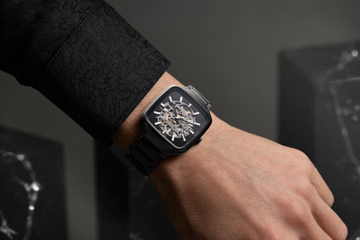 四顆梯形鑽石分別佇立在 3、6、9 與 12 點鐘位置,其餘八顆則細膩標示其他時刻,一粗一細的節奏配置,使錶盤在光影之間呈現秩序感與呼吸空間。經水平拉絲處理並覆以煙灰色塗層的鏤空錶盤,透過水平線條將結構切分為三個區域,讓幾何線性與機芯零件在不同高度層次間對話,既利落現代,又保留機械時計的溫度。透過藍寶石水晶底蓋向內窺視,鎳色調的機芯世界展現另一種沉穩理性的美感。