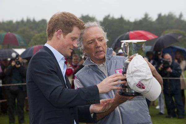 HRH Prince Harry哈里王子殿下和Talandracas隊的贊助人Edouard Carmignac仔細觀察Queen’s Cup皇后杯獎盃(Centaur Photographic/Guards Polo Club)