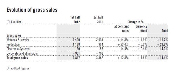 儘管上年業績形成了較高的基數,鐘錶與珠寶部門在2012年上半年仍然保持了強勢增長,營業額高達34億瑞士法郎,較2011年增長16.7%。依靠分銷網絡和零售活動擴張的支持,所有品牌和地區再次實現了同比大幅增長。