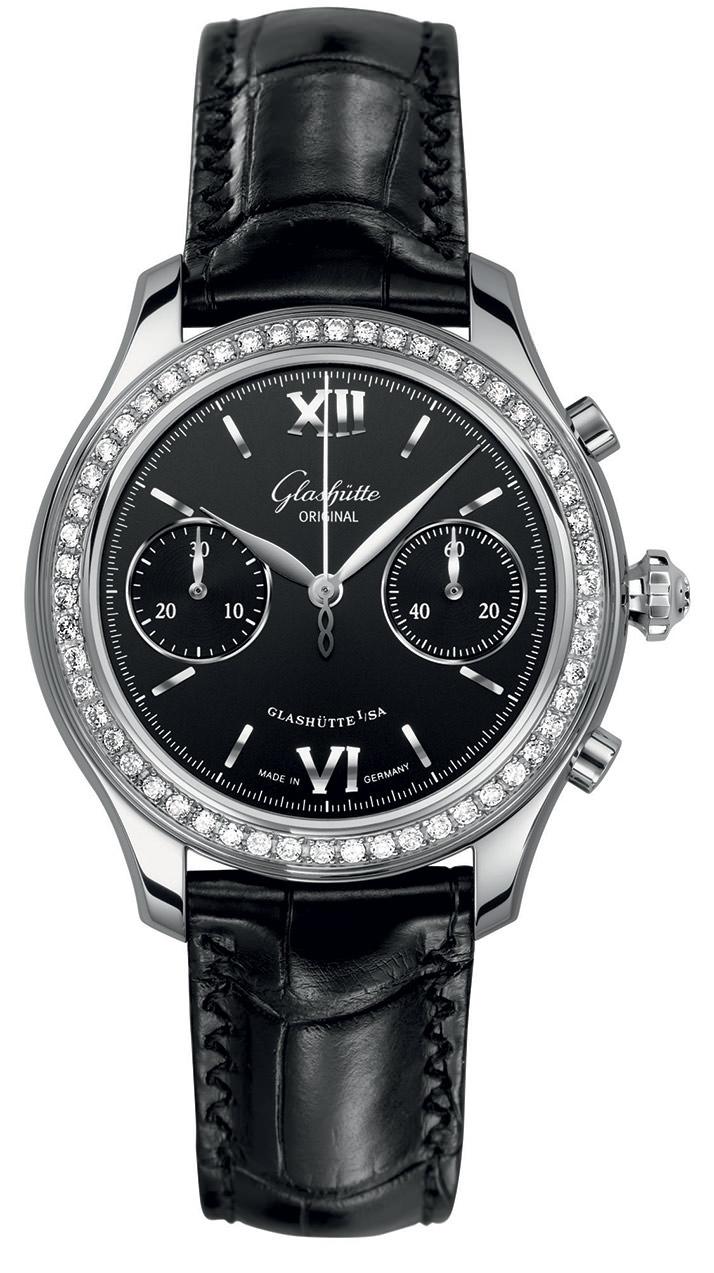 Lady Serenade Chronograph女士腕錶,拋亮的精鋼表殼直徑達38mm,表圈鑲有54顆Top Wesselton IF等級明亮式切割美鑽(總重約1.17克拉),為Lady Serenade Chronograph點綴奢華神韻。太陽放射紋裝飾使得黑色鍍鋅面盤閃耀亮眼光彩,小時刻度時標亦為拋亮的精鋼材質,12和6點鐘位置則以羅馬數字表示。9點鐘方向的分鐘計時盤和3點鐘方向的小秒針盤外圍以銀質刻紋圍繞,更加凸顯於面盤上。錶冠鑲嵌一顆明亮式切割美鑽。防刮的藍寶石水晶玻璃後底蓋可透視工廠自製Cal. 39-34的輕薄計時秒表機芯,動力儲存達40小時,確保時間精確運行。機芯組裝及打磨仍舊維持格拉蘇蒂制表藝術的傳統,例如鵝頸式微調、3/4夾板、格拉蘇蒂太陽放射刻紋等,這枚機芯再度向世人展示格拉蘇蒂原創的高級制表深度。該款腕錶搭配獲得專利的精鋼鏈帶,在手腕上呈現耀眼迷人的柔順感,緞面刷紋及亮面拋光交替的表節,呼應充滿女性曲線的表殼,使這款腕錶更臻完美。