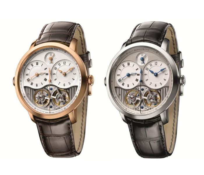 DBG腕錶 - 左:18K玫瑰金表殼,銀白色和蛋白銀色錶盤,表殼直徑44毫米,Arnold & Son 獨有A&S6008手動上鏈機械機芯© Arnold & Son - 右:不鏽鋼表殼,淺灰色和蛋白銀色錶盤,表殼直徑44毫米,Arnold & Son 獨有A&S6008手動上鏈機械機芯© Arnold & Son