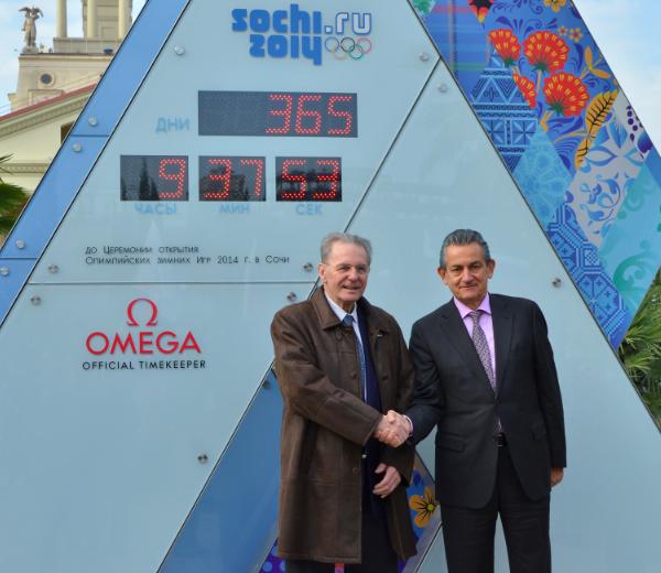 2013年2月6日,歐米茄全球總裁歐科華(Stephen Urquhart)與國際奧委會主席雅克·羅格(Jacques Rogge)在位於索契的歐米茄倒計時鐘前,共同慶祝歐米茄在橫跨俄羅斯的其他八個城市揭幕索契冬奧會一周年倒計時鐘。
