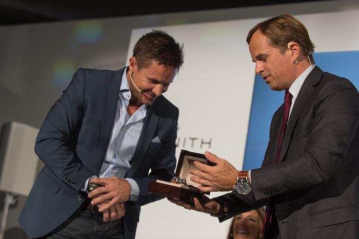 讓-弗雷德里克•杜佛(右)與菲利克斯•鮑加特納(左)出席Zenith真力時BaselWorld巴塞爾世界鐘錶珠寶展發布會