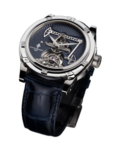 這款手錶的自動上鏈陀飛輪機芯每小時震動21,600次,擁有72小時的動力儲備。47毫米的18克拉白金表殼,汽油藍色錶盤上飾有Côtes du Jura品牌圖案。通過背面透明的表殼可以看到表背的設計,同樣精緻迷人。獨創性的設計賦予這款腕錶無與倫比的藝術風範,讓人愛不釋手。