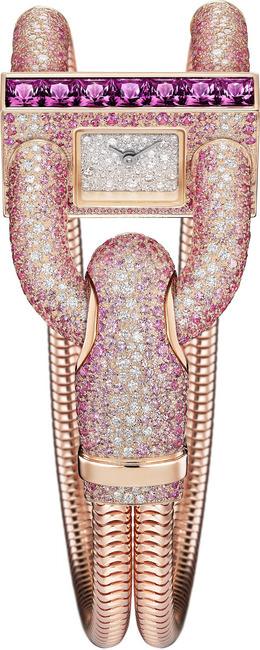 全新款式彰顯腕錶光芒流瀉的珠寶面貌。除表殼頂端飾以公主式切割 鑽石外,表殼、錶盤及表扣整體以雪花式鑲嵌鋪鑲圓鑽,綻放炫亮華彩。如此瑰麗、含蓄而細緻的設計,襯以白K金雙圈圓柱形表鏈,更覺閃爍耀目。Cadenas Pavée全鋪鑲鑽石腕錶另備有玫瑰金款式,鑲嵌粉紅剛玉及鑽石,閃耀柔和婉約的光輝。Cadenas Pavée Saphirs Roses Bracelet Or金質表鏈搭配配全鋪鑲粉紅剛玉腕錶,於表殼及表扣飾有鑽石及漸層粉紅剛玉。