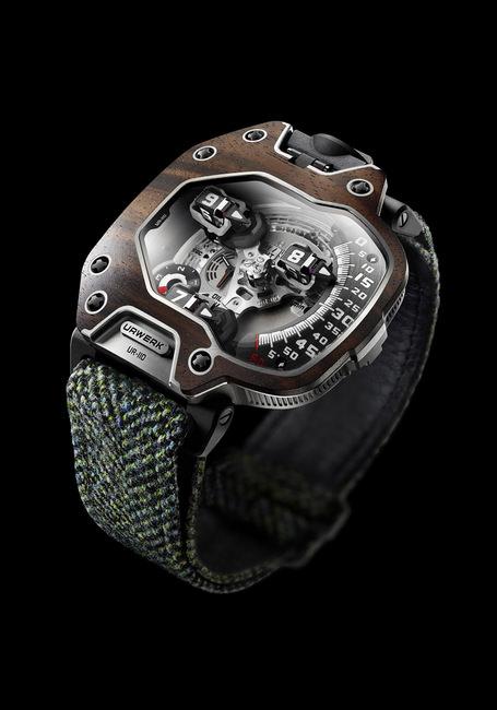 URWERK 的 UR-110 「EastWood」 糅合珍貴木材、定製的羊毛絨粗花呢錶帶及迷人的機械內涵,成就UR-110系列的極致演繹。它的別名為魚雷(Torpedo),採用新穎的拋光烏木表圈及時尚的羊毛絨粗花呢,運用高科技,迸發別具一格的風采及古典韻味。