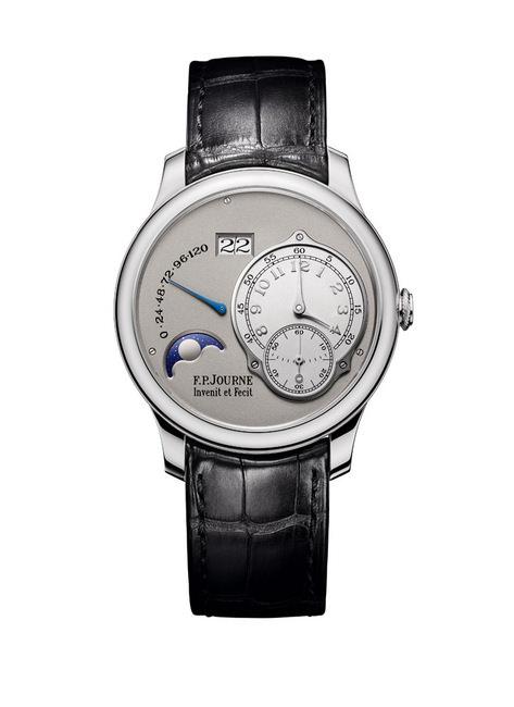 F.P. JOURNE呈獻Nouvelle Octa Lune腕錶。它的時間信息更為易讀,日曆窗的設計又比原作的大兩倍。新作的主錶盤和偏心式時分盤均以18K金鑄造。其中偏心式時分盤的設計比原作的更大,更為清晰易讀,當中的小時數字以浮雕方式製成,並以鑽石打磨工具打磨至光亮。主錶盤同樣以金鑄造而成,其中大日曆顯示由兩個窗口組成,設於11:00時位,動力儲備顯示(120小時,即5天)設於9:00時位,月相顯示則設於8:00時位。