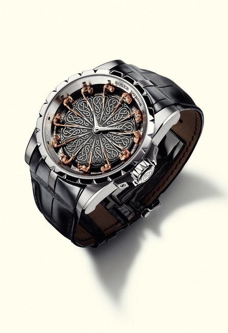 ROGER DUBUIS羅傑杜彼於2013年首度發表了28枚限量版的Excalibur Knights of the Round Table圓桌騎士腕錶,其果敢氣魄與歷史傳說顯耀地綻放光芒。此腕錶以琺瑯材質與貼花方式重新複製了專為亨利八世製作、擺設於溫徹斯特城堡大廳里的英國橡樹圓桌,漆上了象徵都鐸王朝的綠色與乳白色;錶盤上的尊貴騎士圍繞着圓桌而坐。 2015年,ROGER DUBUIS羅傑杜彼再度推出28枚僅在其專賣店出售的限量腕錶,以古銅精雕細琢而成的12位騎士和環繞着珍貴的墨玉錶盤。這個充滿了象徵意義的錶盤經過巧妙鐫刻,為圓桌傳奇做出全新的詮釋,更為腕錶所喚起的神奇力量增添光輝。