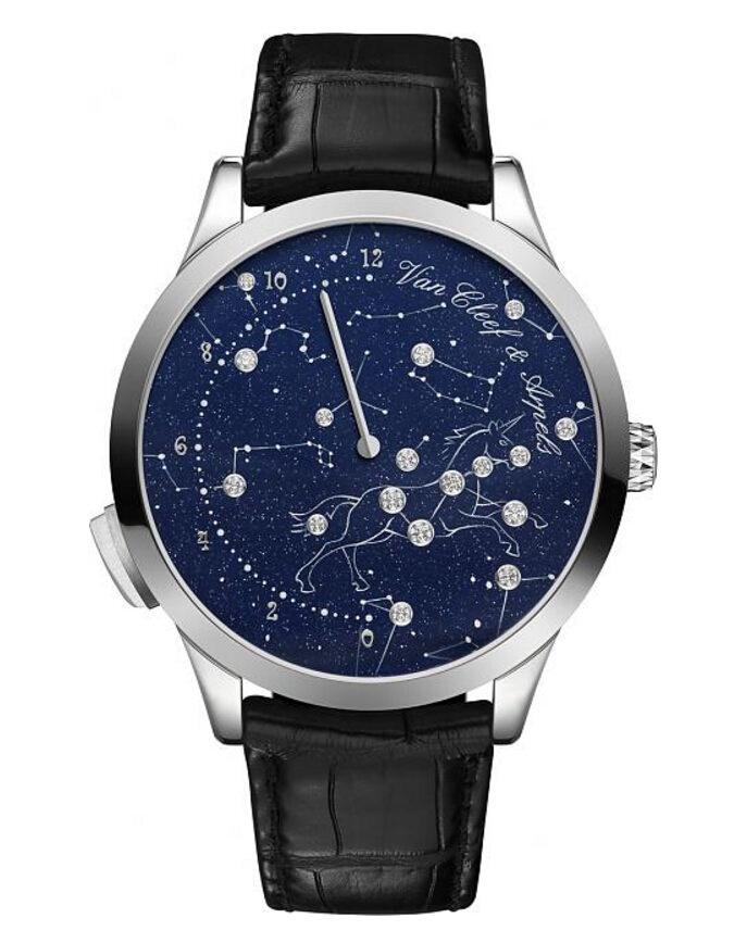 為了重塑逼真的星空效果,表款面盤特別選用砂金石玻璃為底盤,並綴上美鑽星海。純白微型彩繪在星塵間描畫出星宿的線條,麒麟座(又名獨角獸座)在面盤上清晰可見,幽幽呼應VAN CLEEF & ARPELS梵克雅寶的醉人夢幻世界。額上長有尖角的獨角獸是神祕珍獸,自1970年代至今一直是品牌的想像力泉源。面盤上的獨角獸輪廓由六顆美鑽勾勒,鑽光如魔法般點亮星空,脫俗出塵。