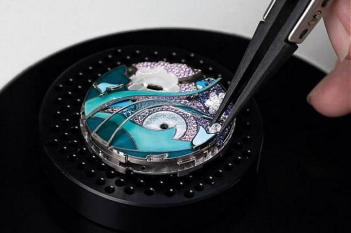 表款面盤上可見品牌以層次豐富的浮雕為背景,重塑出錯落有致的花園景緻,與蝴蝶隨性的舞姿融為一體。梵克雅寶選擇了多重裝飾工藝以捕捉自然界的非凡活力和優雅氣質。梵克雅寶為於Meyrin製表工坊的大師們,正是掌握這些工藝的背後推手。面盤薈萃多項複雜製作工藝︰藍紫色蝴蝶停佇於珍珠母貝雕刻而成的花卉上,雙翼以雙色彩繪玻璃琺瑯細工裝飾。內填琺瑯點綴著綠草如茵的田園景色,數塊弧型葉片以弧面彩繪玻璃琺瑯帶出層次豐富的藍綠漸變色彩。由梵克雅寶獨家研發的新技術,讓琺瑯展現出立體的構圖效果。琺瑯釉彩晶瑩剔透,巧妙糅合立體效果,有效突顯出面盤的縱深。