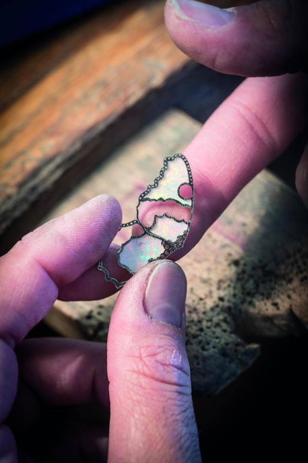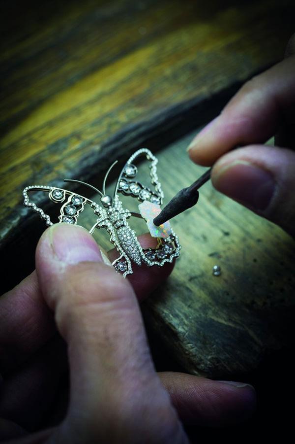 作品與世家的Papillon 蝴蝶胸針一脈相承,是真正的高級珠寶傑作,講求翔實的技術研究,以營造輕靈的機械動態。 蝴蝶身軀經精心設計,以隱藏機械裝置,同時讓雙翼立體生動,可從不同角度細加欣賞。 以白色蛋白石精工雕琢的蝶翅,自閃爍的身軀徐徐展開,切割仔細的寶石,保留蝴蝶翅膀的靈巧美態,特別透薄迷人。 其中,玫瑰切割鑽石以仿蕾絲花邊的網狀細工鑲嵌,讓人得以全方位細賞寶石的美態。 四顆粉紅色藍寶石與蛋白石的炫彩互相輝映,讓柔和婉約的寶石光采極致升華。