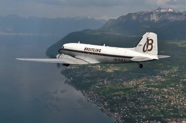 1940 年 3 月 9 日,這架現已繪有百年靈標誌性色彩的道格拉斯 DC-3 雙引擎螺旋槳飛機完成了美國首航。三天後,它被交付給美國航空公司(American Airlines),並在 1942 至1944 年期間由美國軍隊率先使用,之後便陸續為多家北美商業航空公司提供服務。2008年,在百年靈的鼎力支持下,飛行員 Francisco Agullo 與幾位航空愛好者朋友將它購回。經過修復,這架元老級的飛行器以完美狀態重返藍天,成為各大航展及百年靈飛行活動上的常客。
