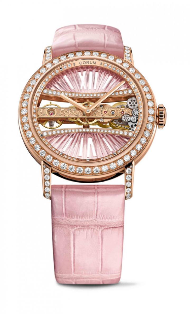 18K玫瑰金材質/CO 113手動上鏈機芯/時、分顯示/面盤鑲鑽106顆,表殼鑲鑽76顆/藍寶石水晶鏡面、透明底蓋/防水30米/表徑39mm/參考價:389,000 RMB