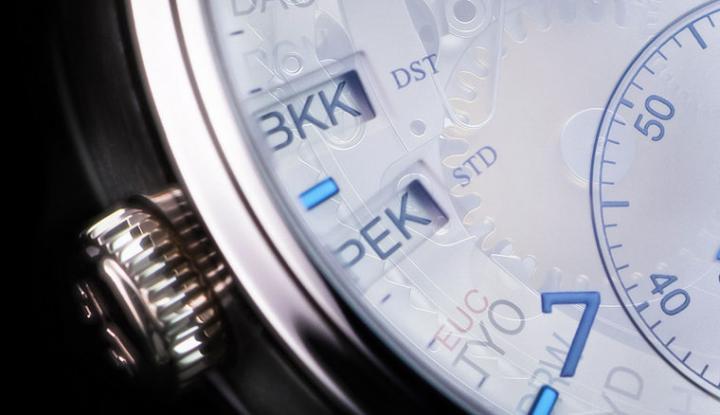 面盤上8點鐘位置的兩個窗口,佩帶者可以區分夏季時間和標準時間 (夏令時DST/標準時間STD);此外,還可以確定本地和目的地的晝夜。在旅行時,機芯複雜機構會對必要的日期向前或者向後作連動調節。