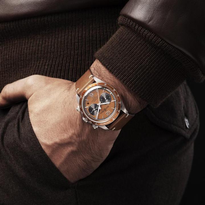 這款充滿復古風格的運動計時受到了四五○年的軍事和航空法規的靈感啟發,採用了超薄表殼、凹進式計數器、讀秒以及復古字體的設計。這是柏萊士與《The Rake》獨家合作的產品,焦糖色面盤與計盤秒鐘刻度環的黑色,以及表圈的牛奶巧克力色形成了絕佳的色彩對比效果。這也就是所謂的熱帶面盤效果。而為襯托出Dusty熱帶錶盤,設計師們更選用了擁有復古針扣的軍事風格棕色錶帶。