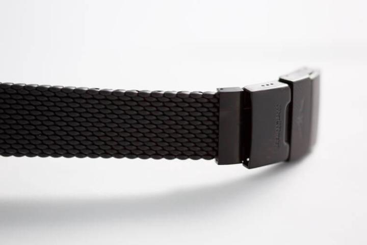 浪琴在2017年所推出的Legend Diver是一般的不鏽鋼表殼,到了2018年則是換上PVD處理,形成全黑的外觀,基本上規格完全沒變,但是面盤在新版黑色表殼的襯托下,隱約會有一種被放大的視覺感受,All Black設計對部分人士而言也更符號運動表想要追求的個性主張。銀白不鏽鋼款當年一推出共有米蘭鏈帶、橡膠錶帶以及牛皮錶帶等三種選擇,到了PVD黑色這款身上,浪琴把選擇性減少了,但是它的鏈帶倒也滿有特色的,簡單的說,它採用表面看起來像是米蘭鏈帶編織紋的黑色橡膠錶帶,雖然就佩戴效果來說,它跟一般的橡膠錶帶沒什麼分別,但是外觀卻更能引人注意,一來得以保持全黑的Tone調,再者如果搭配金屬的米蘭鏈帶,往往價錢也會再提高一些,如今靠着錶帶外部的裝飾,我們就能得到一款長得比較有特色的橡膠錶帶,何樂而不為呢?